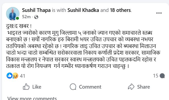 उनले समाजिक सञ्जाल फेसबुकमा स्टाटस लेख्दै नागरिकलाई उचित उपचारको व्यवस्था मिलाउन चाडो भन्दा चाडो सम्बन्धित सरोकारवाला निकाय कर्णाली प्रदेश सरकार, सामाजिक विकास मन्त्रालय र नेपाल सरकार स्वास्थ मन्त्रालयको ध्यानाकर्षण गराएका छन्।