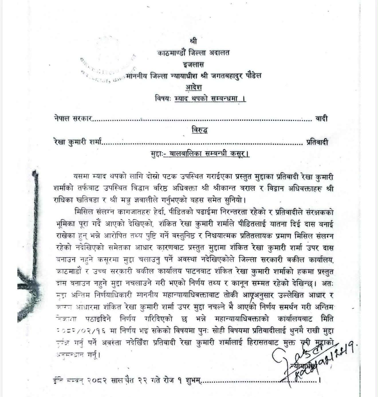 पीडित भनिएकी बालिकाको पढाइमा निरन्तरता रहेको र शर्माले संरक्षकको भूमिका पूरा गर्दै आएको मिसिल संलग्न कागजातबाट देखिएको आदेशमा भनिएको छ।